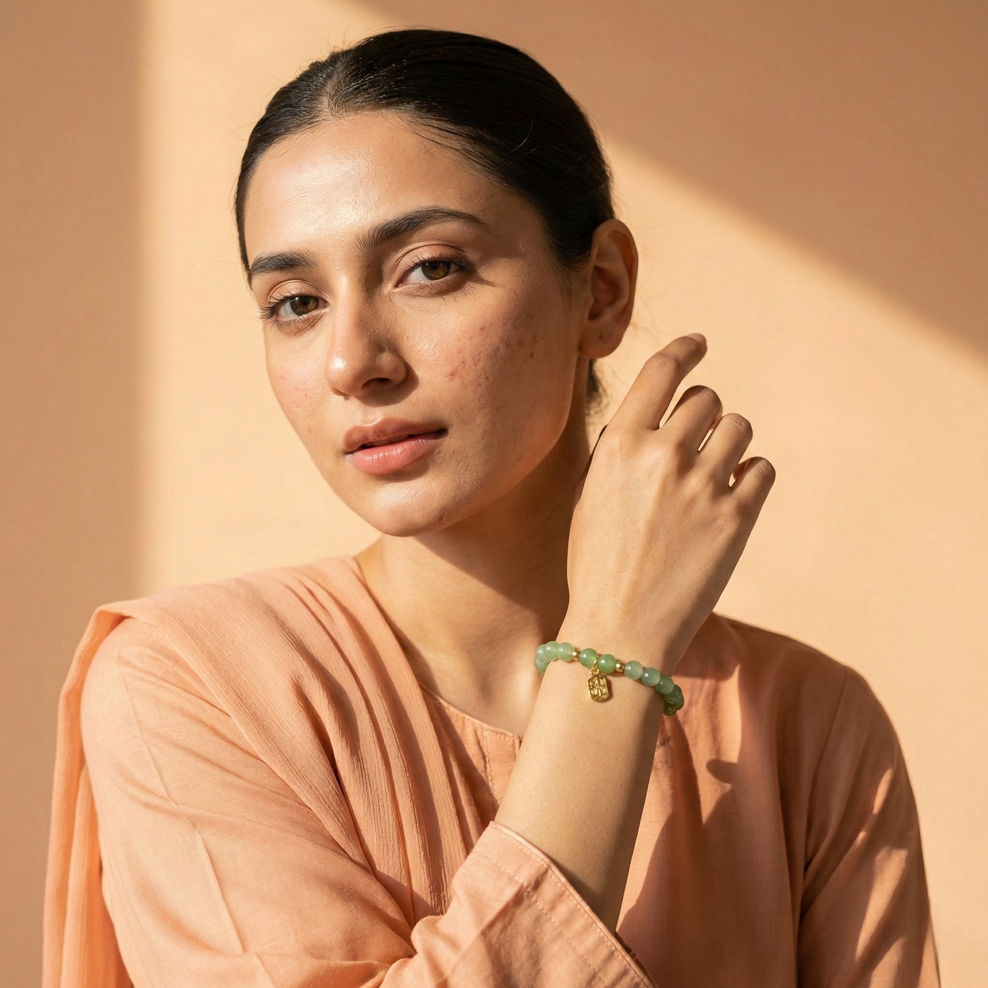 Elevate your everyday look with this serene green beaded bracelet from Zaraab. Featuring smooth, sage-hued beads and a delicate gold-tone rectangular charm, this piece embodies effortless elegance. The warm, earthy tones make it the perfect accessory to pair with both eastern and western wear. Lightweight and durable, this artificial bracelet offers a premium aesthetic that complements your unique style.